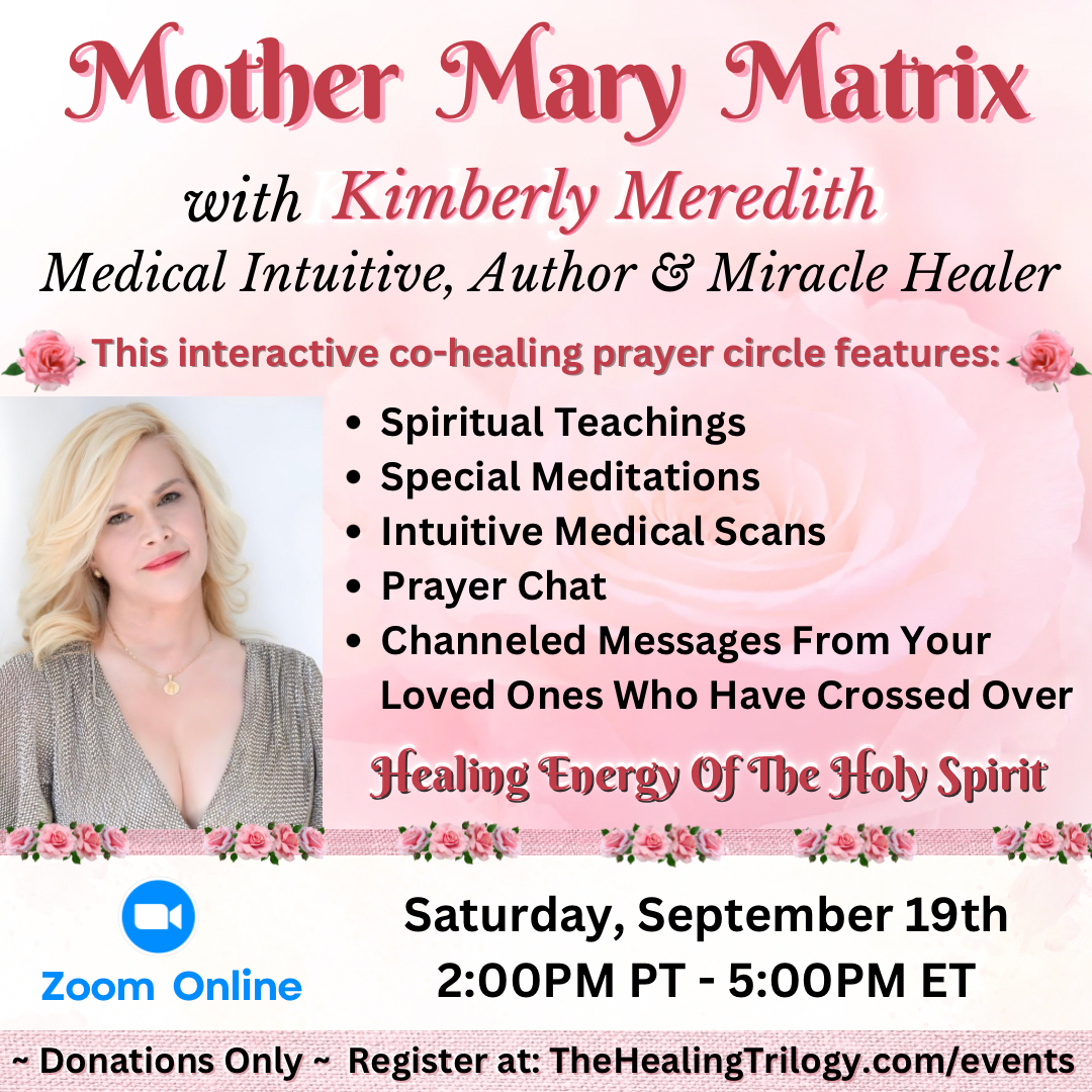 The Mother Mary Matrix interactive co-healing prayer circle features spiritual teaching’s, meditations, and the healing energy of the Holy Spirit, medical intuitive readings and healings, special music and guests, and questions and answers, and prayer requests for healing.